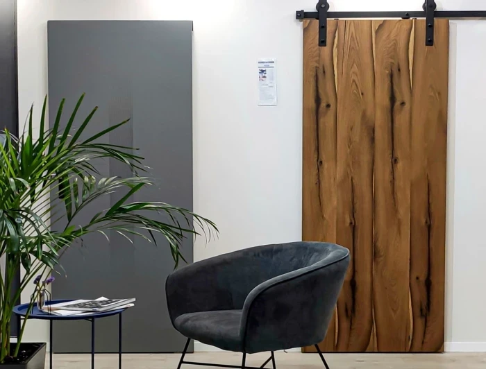 • Дерев'яні міжкімнатні двері, виготовлені з натурального дерева різних порід (вільха, ясень, дуб, горіх);