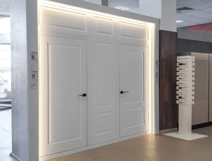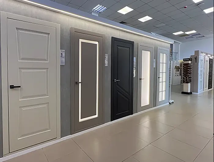 Тут кожна сім'я знайде відповідне виріб для свого будинку. Усередині салону експозиція дверей створена таким чином, щоб покупець візуально бачив, як та чи інша дверне полотно буде виглядати в інтер'єрі. На величезній площі зосереджена велика кількість різноманітних дверних конструкцій. Меблі демонструється в зібраному вигляді в готовому інтер'єрі, що дозволяє оцінити дизайн, меблювання, поєднання кольору ще до покупки.